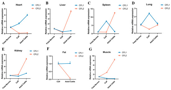 Temporal expression patterns of CFL1 and CFL2 genes in Qinchuan cattle. Expression trends of CFL1 and CFL2 genes in seven tissues (A–G). The expression level of all tissues in fetal bovine was considered as 1. The mRNA expression level of CFL1 and CFL2 were normalized to GAPDH. Data are means ± SE of n = 3 independent experiments, each performed in triplicate.