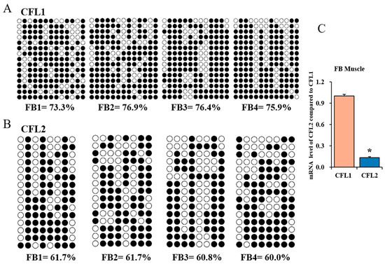 CFL1 promoter DMR (185 bp) has thirteen CpGs, and CFL2 promoter DMR (177 bp) has eight CpGs; we sequenced fifteen clones in each muscle sample, then we obtained 195 CpGs of CFL1 DMR and 120 CpGs of CFL2 DMR. The methylated CpGs percentages of the CFL1 gene were 73.3%, 76.9%, 76.4%, and 75.9% in the FB group. There were 61.7%, 61.7%, 60.8%, and 60.0% of the CFL1 gene. Statistical results showed high DNA methylation levels of CFL1 promotor (mean 75.6%) and CFL2 promotor (mean 61.1%) in the FB group (Figure 3A,B).