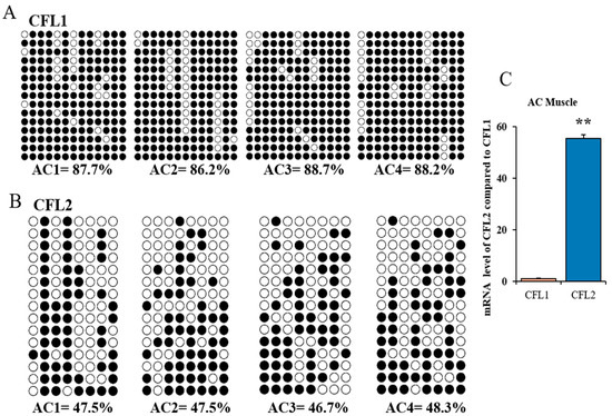 To further demonstrate whether the methylation levels of CFL1 and CFL2 affect their expression level in muscle tissues, we compared the mRNA level of CFL1 and CFL2 genes in the FB group and AC group. Contrasted with CFL1, the expression level of the CFL2 gene was significantly lower in the FB group (p < 0.01) (Figure 3C). In the AC group, the CFL2 gene had remarkably higher expression than CFL1, and the fold difference in relative expression level was about 55-fold (Figure 4C). Combined with the above results, there is a fairly straightforward correlation for tissue-specific CFL2 gene between expression and DNA methylation.