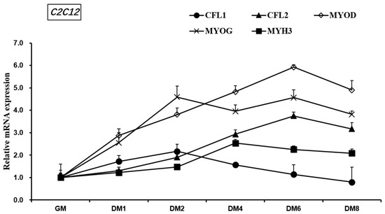Expression trends of CFL1 and CFL2 gene and myogenesis factors were detected in C2C12 cells. C2C12 cells were induced for 1, 2, 4, 6, and 8 days by 2% horse serum, and the relative expression trends of CFL1gene, CFL2 gene, and myoblast differentiation marker genes MYOD, MYOG, and MYH3 were detected by qRT-PCR. The mRNA expression level was normalized to GAPDH. Data are mean ± SE of n = 3 independent experiments, each performed in triplicate. GM, growth medium. DM, differentiation medium.