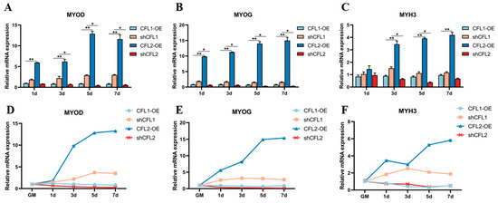 After culturing PBMs and transfecting adenovirus overexpression vector CFL2-OE, the expression levels of MYOD and MYOG were significantly up-regulated at 1–7 d of differentiation (p < 0.01) (Figure 6A,B), and the expression level MYH3 at 3–7 d was significantly up-regulated (Figure 6C). Transfected with adenovirus overexpression vector CFL1-OE, the expression levels of MYOD, MYOG, and MYH3 did not change significantly (p > 0.01), while transfected adenovirus interference vector shCFL1, the expression levels of MYOD, MYOG, MYH3 at 1–7 d of differentiation were significantly trending upwards (p < 0.01) (Figure 6D–F).