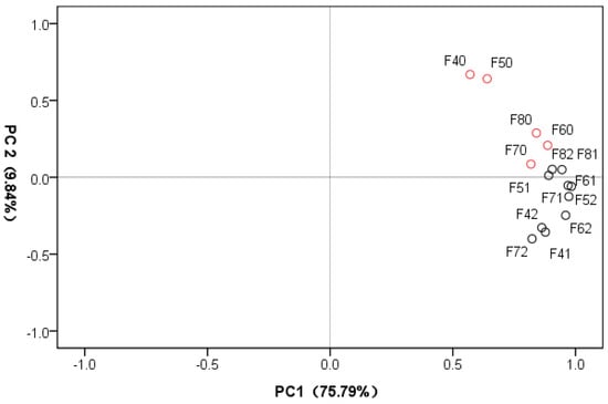 Principle component analysis (PCA) score plot of first and second PCs from 15 fermentation broth samples. PC1: the first principal component; PC2: the second principal component. Red and black colors represent control and Se-treated samples, respectively.