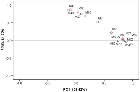 Principle component analysis (PCA) score plot of first and second PCs from 15 mycelial samples. PC1: the first principal component; PC2: the second principal component. Red and black colors represent control and Se-treated samples, respectively.