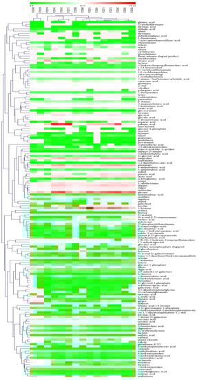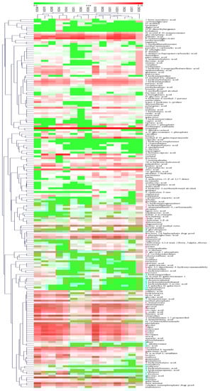 A similar pattern was observed with the hierarchical clustering analysis of the 197 identified intracellular metabolites from the mycelia. There was again a clear separation noted between samples. Here, the 15 samples were grouped into two distinct classes: one category consisted of 5 samples (both the control and Se-treated samples for week 4, as well as control samples between weeks 7 and 8), and the other consisted of the remaining 10 samples (both the control and treated samples between weeks 5 and 6, as well as treated samples between weeks 7 and 8) (Figure 5). Likewise, 197 metabolites were divided into two groups, consisting of 60 and 137 compounds.
