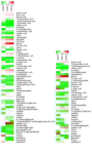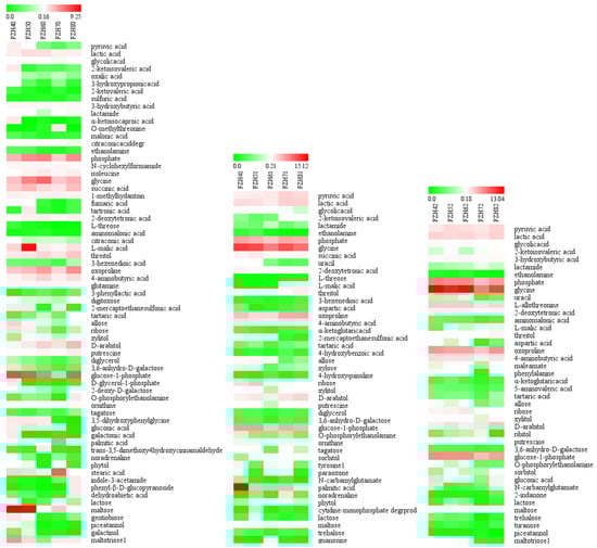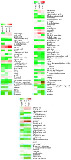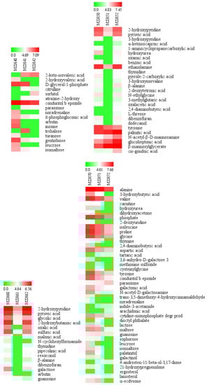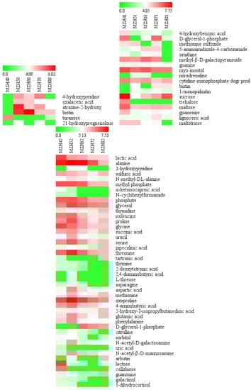 At Se concentrations of 0, 0.1, and 0.2 mmol/L, we detected 67, 47 and 39 marked metabolites, respectively, in the fermentation broth using statistical analysis (p < 0.001) during the cultivation period (Figure 7). There were 25 common metabolites among Se concentrations, such as glycine, oxoproline, 4-aminobutyric acid, putrescine, lactamide, ethanolamine, O-phosphorylethanolamine, allose, ribose, D-arabitol, 3,6-anhydro-D-galactose, lactose, maltose, glucose-1-phosphate, threitol, xylitol, pyruvic acid, lactic acid, glycolic acid, 2-ketoisovaleric acid, sulfuric acid, phosphate, 2-deoxytetronic acid, L-malic acid, and tartaric acid.