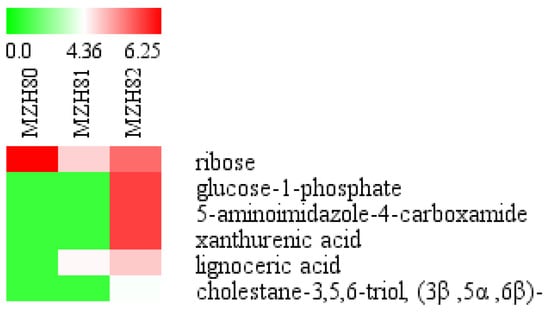 Heatmap of the abundance of identified metabolites in the mycelia of Epichloë sinensis under selenium concentrations in a given cultivation time. Red and green blocks indicate higher or lower metabolite levels (see scale bar). MZH40, MZH41, and MZH42 represent mycelia grown for 4 weeks in the presence of 0, 0.1, or 0.2 mmol/L Na2SeO3, respectively. MZH50, MZH51, and MZH52 represent mycelia grown for 5 weeks in the presence of 0, 0.1, or 0.2 mmol/L Na2SeO3, respectively. MZH60, MZH61, and MZH62 represent mycelia grown for 6 weeks in the presence of 0, 0.1, or 0.2 mmol/L Na2SeO3, respectively. MZH70, MZH71, and MZH72 represent mycelia grown for 7 weeks in the presence of 0, 0.1, or 0.2 mmol/L Na2SeO3, respectively. MZH80, MZH81, and MZH82 represent mycelia grown for 8 weeks in the presence of 0, 0.1, or 0.2 mmol/L Na2SeO3, respectively.