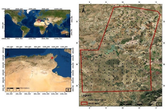 Location of the study area. (A) Tunisia’s location worldwide, (B) Governorate of Zaghouan in Tunisia and (C) Study area.