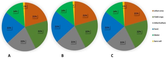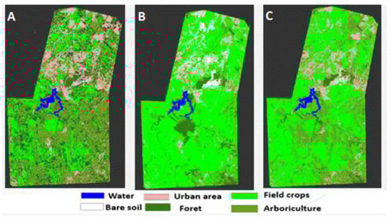 Among the three obtained LU maps, our data revealed that the six classes of the LU map depended on the choice of the supervised algorithm. In fact, according to the LU field survey and Google Earth, the RF classification, with homogeneity of class distribution (water, forest, urban area, bare soil, fields crop and arboriculture), is more realistic (Figure 3). Moreover, MDC and KDTree-KNN provided a big difference in the obtained maps, where the field crop class is the most dominant in the produced map, showing, in most cases, a lack of precision.