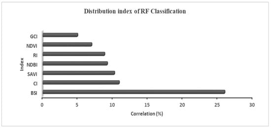 In our investigation, the correlation of the index distribution (GCI, NDVI, RI, NDBI, SAVI, CI and BSI) in the RF classification used in this investigation showed that the highest value was obtained for the Bare Soil Index (BSI), with more than 25% (Figure 5), and the lowest correlation values were obtained for NDVI and GCI (less than 7%) (Figure 5).