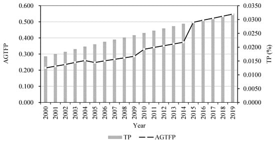 (1) The data used in the calculation of AGTFP in this paper are the provincial agricultural output and input data of 30 provinces in mainland China (except Tibet) from 2000 to 2019.