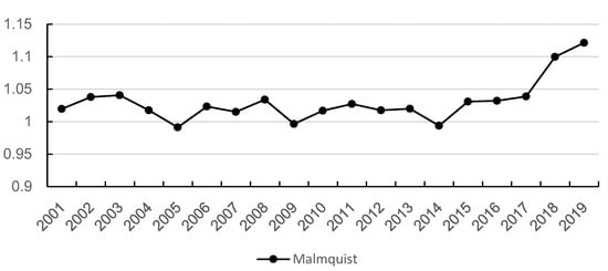 In the calculation of AGTPF, we chose penalized regression to deal with Equation (1). In order to test the accuracy of the model calculation results, we first used the superefficient SEM model to estimate the Malmquist index to calculate China’s AGTFP and observe its trend change. Then, we used the Malmquist index to verify whether there is a significant effect of carbon emissions trading pilot policies on AGTFP. Finally, we used the Malmquist index to test whether the carbon emissions trading pilot policies affect AGTFP through two mechanisms: regulation and innovation.