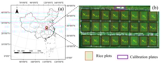 Study area and rice-plot settings: (a) experimental-area location; (b) nitrogen-gradient layout of rice plots.