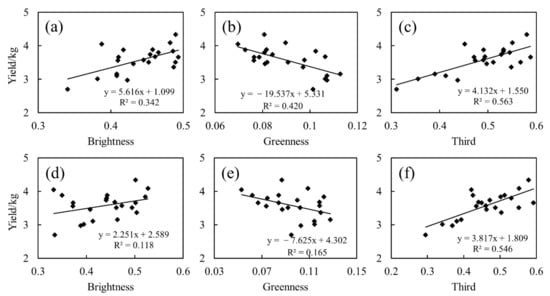 After completing the normality test (Table 2), a strong correlation (r > 0.5) was shown between the TCT parameters and rice yield during the booting period (Table 3). However, in the latter stage, the correlation between the yield and the brightness and greenness components was significantly lower. A linear fit of the yield and TCT parameters revealed a satisfactory result for the third component at both stages (R2 values more than 0.5), but saturation was present at the booting stage (Figure 6). Meanwhile, no saturation was observed when using the brightness and greenness to predict the yield, but the performance was poor (R2 values below 0.5 at the booting stage, and below 0.2 at the heading stage).
