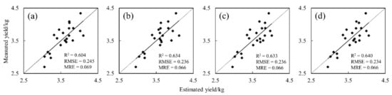 The yield-prediction model was assessed by employing the leave-one-out cross-validation (LOO-CV) method to reduce the reliance on a single random fraction of the calibration and validation dataset [35]. In this paper, the iterative process was repeated 22 times to ensure that each piece of data was engaged in the validation (the yields of two plots were removed as a result of serious problems during harvesting). The adjusted R2, RMSE, and MRE were selected as the final accuracy metrics [11].