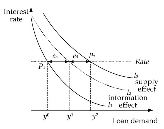 The internal mechanism of how the use of digital payment affects the bank loan behavior of farmer households is shown in Figure 2. Unlike investment, the impact of digital payment on bank loans is first realized by changing the method of information transmission. On the one hand, digital payment alleviates the information asymmetry in the financial market, thereby reducing the resulting transaction costs [33]. It improves the financial knowledge of farmers and reduces implicit financial exclusion due to lack of financial knowledge. On the other hand, digital technology increases the accessibility of financial institutions by reducing the operating costs of banks. The effects of these two aspects have made it possible to flatten the supply–demand curve without increasing the supply in the financial market. The bank loan supply–demand curve has changed from l1 to l2, and the bank loan demand of the farmer households has increased by e3. Digital technology pushes the bank loan demand of farmer households to the back end of the long tail, and the inclusion effect is more obvious for disadvantaged groups closer to the bottom of the demand market. The inclusive mechanism by which digital payment has improved information efficiency and reduced financial costs is called the “information effect”. Traditional financial institutions can use digital technology to create more inclusive credit products through low-cost operations, increasing the supply of loans to a certain extent. Farmers who use digital payments can use these new supplies to meet their borrowing needs, making the supply–demand curve of financial market shift right from l2 to l3, and the demand for bank loans increases by e4. The mechanism of the inclusive effect due to increased supply is called the “supply effect“. The use of digital payment eventually makes the equilibrium point move from P1 to P2, that is, the demand for bank loans of farmer households eventually increases by P2–P1.