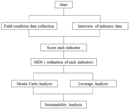 Sustainability analysis using the RAPPO (Figure 1) technique begins by reviewing, identifying and defining the indicators used. After that, an assessment (scoring) of the analyzed indicators is carried out. Scoring is based on the conditions that have been set in the RAPFISH technique. The scoring data are then processed using the software facility (software) RAPFISH (version 1.0), which is compressed (add-ins) on MS-Excel. According to the input of the indicator scores arranged in the Rap Scores matrix in the form of MS-Excel software worksheets, the data processing process takes place in the software.