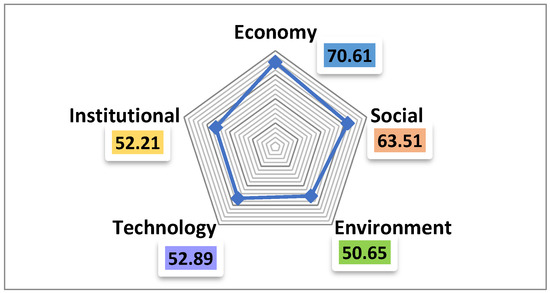 Based on the results of the RAPPO analysis in Figure 2, the multidimensional value of the community oil palm agribusiness sustainability index was 59.61. This value is influenced by the calculation of the combined analysis of all dimensions (economic, social, environmental, institutional and technological), which is called multidimensional analysis in the MDS analysis; values that are in the range of 50–75 are included in the “fairly sustainable” category.