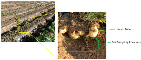The experiment was conducted on the soil around the potato tubers during the harvest period. The soil type is sandy loam, and the sampling site is in Huining County, Gansu Province. The potatoes are planted in mid-April, with machine seeding and mulching after the machine ridging. The harvest time is from September to October each year. The ridge shape of the field was measured during the harvest period, and a ridge height of 200 mm, a ridge bottom width of 500 mm, and a plant spacing of 350 mm were obtained. Tubers were produced at 15–20 mm from the surface of the top of the ridge. Sampling was conducted in the field by hand digging in a five-point sampling method to collect soil around the potato tubers for a series of experiments, and the soil sampling location is shown in Figure 1. The particle size distribution of the sample can be measured after sieving the soil: 54.66% of the mass with a particle size less than 4 mm, 19.88% with a particle size between 4 and 7 mm, and 25.47% with a particle size greater than 7 mm. The density of the samples was measured and calculated to be 1100 kg·m−3, with a coefficient of variation of 3.19%. The measured water content of the soil was 15.38%, and its coefficient of variation was 4.60%.