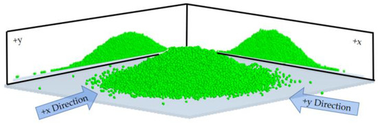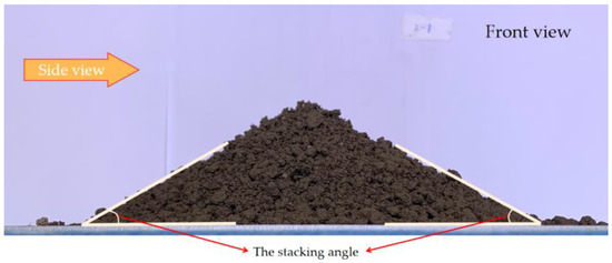 A square steel plate was created in EDEM software, and a cylinder with the same inner diameter of 100 mm and height of 160 mm was created above the plate as the actual test. The radius of the soil grains was set to 4 mm, and the same mass as the actual soil was generated by the static factory. When the particles inside the cylinder had been stabilized, the cylinder was lifted so that the soil grains flowed out of the cylinder to form a stacking angle. The stacking angles obtained from the simulation were saved as pictures from both +x and +y directions, as shown in Figure 3. As in the actual test, the degree of the stacking angle can be derived after image processing, and the average value of the four angles was used as the result of one test.