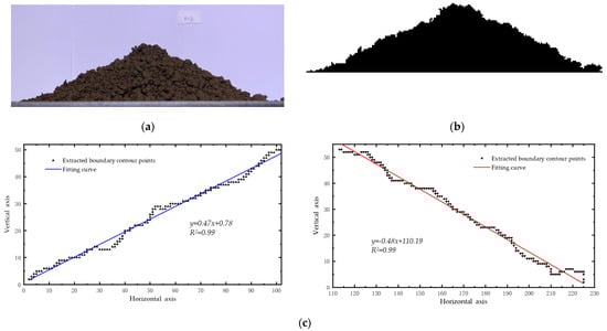 Image processing and fitting process of stacking angle. (a) The result of the soil stacking angle obtained from the test. (b) The result of the stacking angle after image processing. (c) The result of curve fitting after boundary extraction.