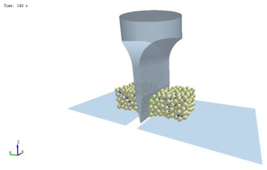 In the discrete element study related to potato harvesting machinery, digging, potato-soil separation, and other links can break up large soil blocks. The Hertz–Mindlin model does not allow for particle fragmentation. It is necessary to bond small soil grains by attaching a bond model to form a large soil block with a certain strength. The bond is removed when the parameter of the bond between the particles reaches the set value, and thus the block is broken. So, the Hertz–Mindlin with bonding model was used to perform discrete element simulation of the soil block shear crushing process. A rectangular body of 25 mm in length and 15 mm in width and 10 mm in thickness was created in EDEM. The interior was filled with small soil grains of 2 mm diameter with an additional bond between the soil grains. The shear cutter was modeled by SolidWorks 2018 and imported into EDEM, with the cutter position set directly above the middle of the soil block. Two support plates were established symmetrically with the cutter as the center and their spacing was 5 mm. The cutter speed was set vertically downward with a speed of 5 mm/min. The time step was set to 1.7 × 10−5 s for simulation calculation. The maximum crushing force during soil fragmentation was obtained. The discrete element simulation model built was shown in Figure 6.