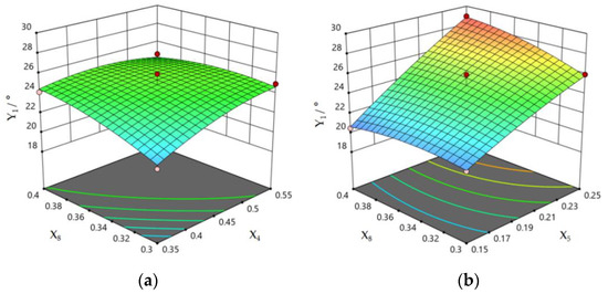 Effect of the interaction between factors on the degree of stacking angles: (a) response surface under factors X4 and X8; (b) response surface under factors X5 and X8.