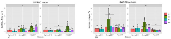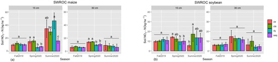 Effects of N–fertilized winter camelina double cropped with maize and soybean on soil available N at two soil layers: (a) 0–15 cm and (b) 15–30 cm with standard deviation. Southwest Research and Outreach Center (SWROC), 2019–2020. ctr = control relay, cts = control sequential, rly = relay cropping, and seq = sequential cropping. In a given season and depth within a location, bars followed by different letters are significantly different at p ≤ 0.05.