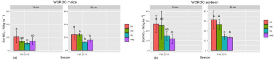 Effects of N–fertilized winter camelina double cropped with maize and soybean on soil available N at two soil layers: (a) 0–15 cm and (b) 15–30 cm. Vertical lines denote standard deviation. West Central Research and Outreach Center (WCROC) 2018–2019. ctr = control relay, cts = control sequential, rly = relay cropping, and seq = sequential cropping. In a given season and depth within a location, bars followed by different letters are significantly different at p ≤ 0.05.