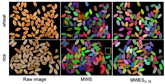 Segmentation examples of cereal grain images with MWS and MWES[c,b].
