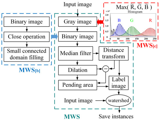 Flow diagrams of MWS and the improved watershed segmentation algorithms (MWS[b] and MWS[c]). Middle dotted box presents the procedure of MWS, in which the acquisition process of gray image is replaced by the right dotted box representing MWS[c], and the acquisition process of binary image is replaced by the left dotted frame representing MWS[b]. R, G, B represent the red, green and blue channel of the input image, respectively.