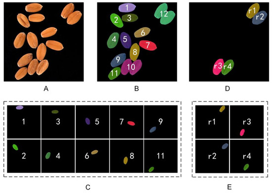 In the field of food industries, the physical size and the appearance quality of cereal grains are directly related to the market value of cereals [1,2,3,4]. For instance, the market value of broken grains is only 60~80% [1], and moldy grains lose almost all edible value [4]. Some advanced technologies based on computer vision have been applied to assess the quality and count the size distribution of cereal grain samples, in which an accurate instance segmentation to the cereal grain image is an important practice [5,6]. Taking advantage of the instance segmentation results, we can accomplish the intelligent classification task of imperfect cereal grains by a fine-grained network [7,8]. In addition, it is easy to measure the size distribution of the sampled cereal grains, such as the area, perimeter, and long–short axis ratio.