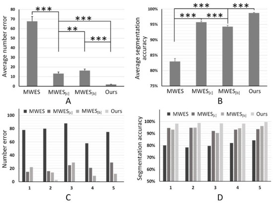 Statistical results of the number error and the segmentation accuracy. (A) represents the average number errors of 25 images in four methods. (B) represents the average segmentation accuracies of 25 images in four methods. (C) represents number errors of five different images in four methods. (D) represents segmentation accuracies of five different images in four methods. Error bars represent the standard error of mean (SEM) (*** p < 0.001; ** p < 0.01; T test with analysis of double-sample mean in pairs).