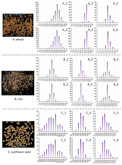 The physical size of cereal grains determines the cereal milling yield and its market value to a certain extent. Generally, grains with a larger average size may contribute to a higher milling yield, and grains with better consistency may be more popular among customers [1]. In this research, we count the size distribution of cereal grains (including perimeters, areas, and long–short axis ratios) based on our segmented instances and the manually sketched instances. On the one hand, it tests the robustness of our instance segmentation algorithm in actual application, and on the other hand, it verifies the accuracy of our segmentation results. Figure 8 shows the size distribution results of a wheat image (Figure 8A), a rice image (Figure 8B), and a sunflower seed image (Figure 8C), respectively. Figure 8(A_1,A_3,A_5) represent the area distribution, the perimeter distribution, and the long–short axis ratio distribution of our segmented instances in the wheat image, respectively. Figure 8(A_2–A_6) represent the corresponding distribution results of manually sketched ground truth instances. Figure 8B,C are analogous to Figure 8A. In all of the distribution histograms, the horizontal axis represents the distribution interval, and the vertical axis represents counted numbers. There is little discrepancy between the distribution results of our segmented instances and those of the manually sketched instances.
