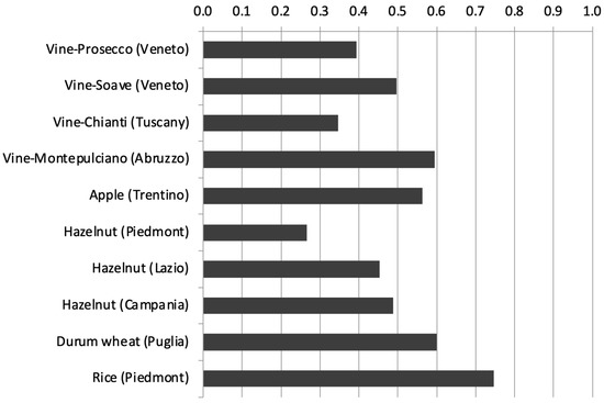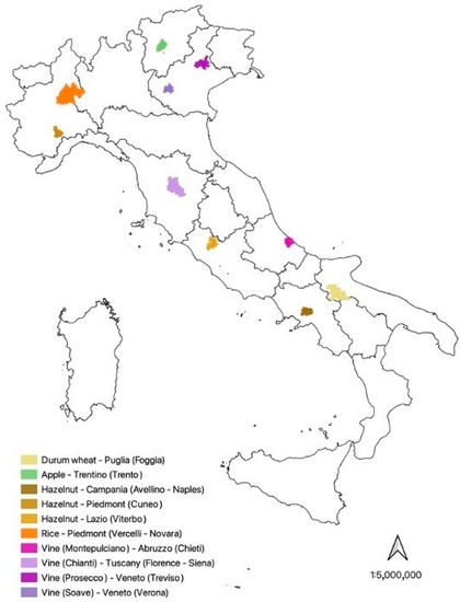 Among the crops showing a tendency to concentrate in particular areas of the country, the choice of areas in which carry out a quantitative analysis was based on bibliographic research in which the most widespread cultivation was somehow defined as “monoculture”. Indeed, it is worth mentioning the following: vine [16,17,18], apple [19,20], hazelnut [21,22,23,24], durum wheat [25,26] and rice [27,28].