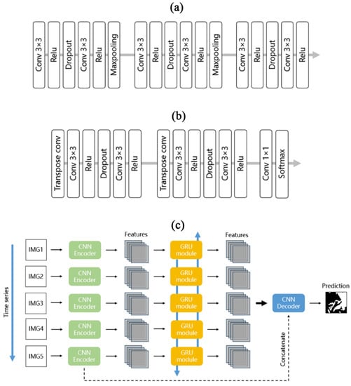 We constructed an R-CNN model based on the UNet structure and GRU modules, as shown in Figure 2. The model is mainly composed of three parts: CNN encoders, GRU modules, and a CNN decoder. First, each batch of data is input into the model through six 3 × 3 convolutional layers (with a stride of 1, the “same” padding, and a ReLU activation function) and two 2 × 2 maxpooling layers. To effectively enhance robustness and prevent the model from overfitting, a dropout layer is added after the first convolutional layer of each level. Second, the extracted feature vectors of spatial information are fed to the GRU modules in the time series, and the hidden state sequence is calculated by the GRU network. Note that we use a bidirectional GRU network here that can integrate information from both forward and backward states. In addition, four 3 × 3 convolutional layers and two 2 × 2 transposed convolutional layers are built to map the features with the same spatial resolution size as the input data. Meanwhile, the skip connection in the original UNet model is retained in our model. Finally, a 1 × 1 convolutional layer and softmax activation function are used to output the predicted results.