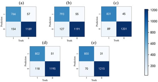 Confusion matrix for the spatial distribution of tea plantations in Xinchang County predicted by the (a) SVM, (b) RF, (c) CNN, (d) RNN, and (e) R-CNN methods.