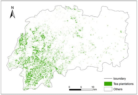 Tea is an evergreen woody plant whose leaves can produce a beverage that is known as one of the world’s three major drinks together with cocoa and coffee []. As an economically important crop, tea plays a significant role in promoting the prosperity of many developing countries []. Accounting for nearly 38% of the global total tea yield, China has the largest tea industry in the world, as it plants and produces tea in more than 20 provinces []. According to statistics, as one of the major provinces producing tea in China, Zhejiang Province produced approximately 177,200 tons of tea in 2020 [], which accounted for a considerable proportion of the national tea yield. With the growing demand for tea, the area of tea plantations is also increasing. On one hand, tea can promote the development of the local economy, but on the other hand, it may cause some negative effects, such as the destruction of the ecological environment. At present, it is an urgent problem to implement correct supervision of tea plantations and effectively maintain a balance between the economic benefits brought by tea production and a series of adverse effects caused by the expansion of tea plantations. However, how to efficiently and accurately acquire the spatial distribution of tea plantations has always been a difficult problem in the process of fine and dynamic management of tea plantations. Therefore, the proposal of an effective method for extracting tea plantations is of great significance for monitoring the area of tea plantations and carrying out tea tree disaster alert work, thus improving tea production and quality. In addition, it can enhance the standardized management of tea plantations to boost garden greening configurations, conserve water, improve soil quality, raise biodiversity, and promote the sustainable development of the ecological environment.