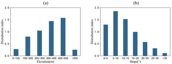 Distribution index of tea plantations in Xinchang County: (a) distribution index with elevation and (b) distribution index with slope.