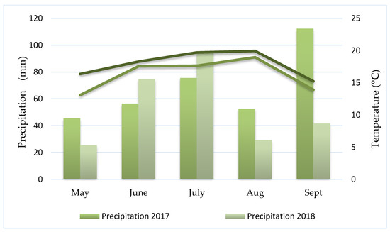 Values of Sielianinov’s hydrothermal coefficient show that, in 2017, May and June were quite dry, July was optimum and was followed by a dry August and very wet September (Figure 3). In 2018, May and August were very dry, June and July were optimum and September was dry.