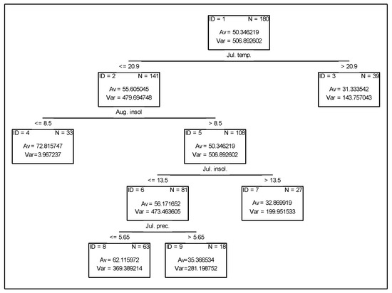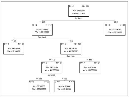 The amount of atmospheric nitrogen acquired by soybean plants treated with biostimulants was higher compared with the control. Similarly to the model for the control unit, in the obtained models (Figure 5 and Figure 6), the first and most important split into branches (marked with the identifiers ID = 2 and ID = 3) was affected by the temperature in July, and the second one (ID = 4 and ID = 5) by insolation in August. Further splits depended on the applied biostimulant and were affected by insolation in July (after treatment with Asahi) or June (after spraying with Improver), and daily precipitation sums in July. If, additionally, daily insolation in July and June did not exceed, respectively, 13.5 and 11.5 h and was accompanied by a daily precipitation sum of up to 5.65 mm, soybean plants tended to fix an average of 61.1 or 59.7 kg nitrogen, respectively (Figure 5 and Figure 6). Szparaga et al. [45] demonstrated that soybean plant growth, yield and biometric parameters of seeds were affected by biostimulant type, concentration and number of applications. Moreover, the authors reported that treatment with synthetic biostimulants affected protein and fat contents in soybean seeds which tended to decline regardless of the number of applications or concentration of the products. There was a strong negative correlation between the total protein content and plant height (r = −0.91), number of seeds (r = 0.72) and seed yield (r = −0.69) following an application of Tytanit. The plants modified their metabolism so that, instead of producing storage proteins, energy was used for stem, leaf and pod growth [46], as well as an accumulation of fat which is the major storage material in soybean seeds. The authors point to the fact that apart from various active compounds in the test biostimulants, their concentration and rate, soybean performance and seed quality were also affected by environmental factors occurring throughout the growing season. Treatments with biostimulants increase the content of ‘pest-related’ components such as phenols or dietary fibre, both of which usually increase as part of a systemic response of plants to stressors [47,48].