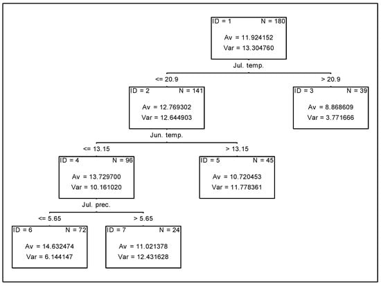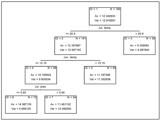 Regression trees describing the amount of nitrogen taken up by soybeans from fertiliser consisted of four terminal nodes. Both in the control unit and plots treated with biostimulants, the amount of nitrogen taken up from fertiliser was predominantly affected by temperatures in July and June, and precipitation in July. When the temperature in July exceeded 20.9 °C, fertiliser nitrogen uptake by soybean plants was the lowest and ranged from 7.71 (no biostimulant) to 9.35 kg (treatment with Improver), it being the highest (from 10.64 to 14.98 kg) when the temperatures in July and June did not exceed 20.9 and 13.15 °C, respectively, and daily precipitation sums in July were up to 5.65 mm (Figure 7, Figure 8 and Figure 9). Research by LeMenza et al. [49] has shown that, when grown under conditions which allow soybean to produce yields higher than 2.5 Mg ha−1, the crop may positively respond to nitrogen fertilisation. Unfortunately, a high concentration of mineral nitrogen forms in soil tends to inhibit elemental nitrogen reduction conducted by nodulating bacteria by hampering the activity of enzymes which are involved in this process, and the development of root nodules. Furthermore, research by Salvagiotti et al. [50] has demonstrated that mineral nitrogen has a negative effect on nodulation and N2 fixation by soybeans, excluding nitrogen starter fertiliser applied during sowing.
