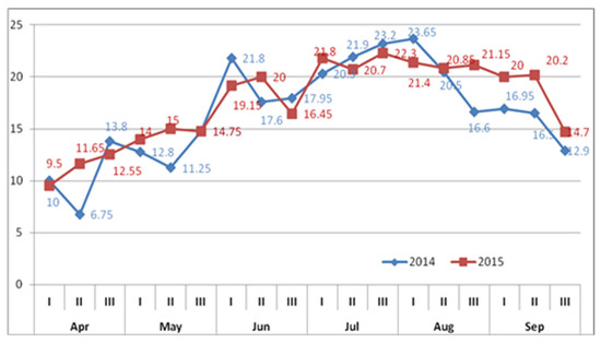 Temperature (°C) during the growing period for the experiment in 2014–2015.