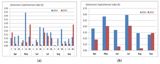 In the analyzed period of research, soil drought was noted both years in terms of a decade and months (Figure 3a,b). The conducted observation imply that in two years of the study the extreme drought (K ≤ 0.4) occurred in each decade, with the exception of 1st decade of May. On the monthly frame, it was found that in May and July very dry period (K 0.4 < 0.7) was observed only in 2014.