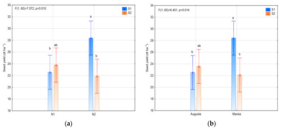 A similar phenomenon was observed in the case of the interaction of sowing date and cultivar (Figure 3b). Early sowing of the Mavka cultivar resulted in an average yield increase of 0.6 dt in comparison to the Augusta cultivar.