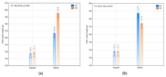 Irrespective of the sowing date, TSW was significantly higher for the Mavka cultivar than for the early Augusta cultivar (Figure 5). There was a significant increase in the 1000 seed weight of the Mavka cultivar sown at the late date (195 g). Early sowing of the Mavka cultivar limited its potential to produce large seeds. The 1000 seed weight was low—on average 30 g lower than in the case of the late sowing date.