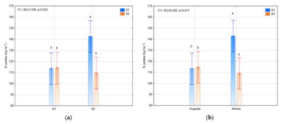 Significant effect of interaction of fertilizer and sowing date (a) and cultivar and sowing date on efficiency of N uptake (b). The standard error (SD) of each mean is presented as an error bar. The occurrence of the same letter pointer at averages (at least one) means that there is no statistically significant difference between them.