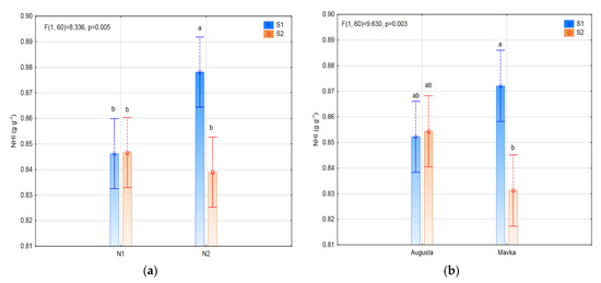 NHI was significantly differentiated by the interactions; in both years the interaction between sowing date and fertilizer and the interaction between sowing date and cultivar were significant (Figure 7). Higher fertilization (F2) of the Mavka cultivar sown at the early date significantly increased NHI by 0.8.