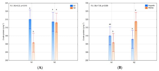 Significant interaction of sowing date and fertilization (A) and fertilization and cultivar (B) on crude protein content. The standard error (SD) of each mean is presented as a bar. The occurrence of the same letter pointer at averages (at least one) means that there is no statistically significant difference between them.