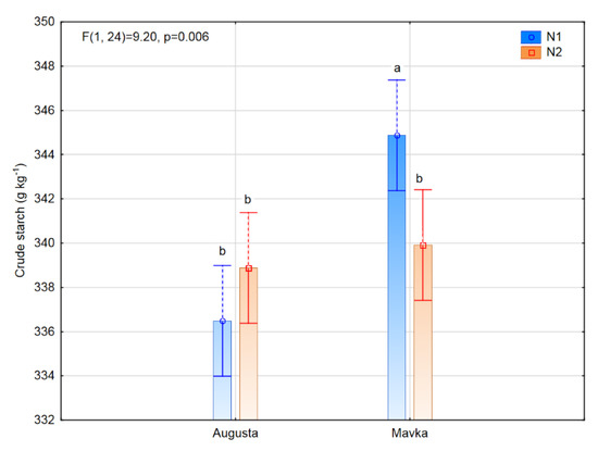 Significant interaction of cultivar and fertilization on crude starch (2015 year). The standard error (SD) of each mean is presented as a bar. The occurrence of the same letter pointer at averages (at least one) means that there is no statistically significant difference between them.