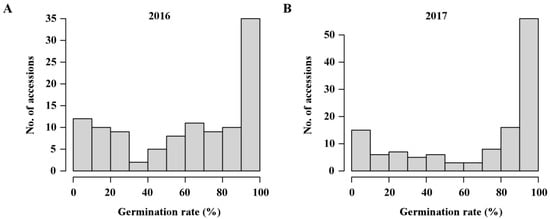 Natural variation for seed germination in Japonica rice. The distribution of germination rate at three days after imbibition in 2016 (A) and 2017 (B).
